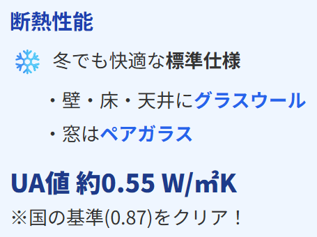 断熱性能を示すUA値は、アイダ設計の建売住宅で0.55W/㎡K程度といわれています。
