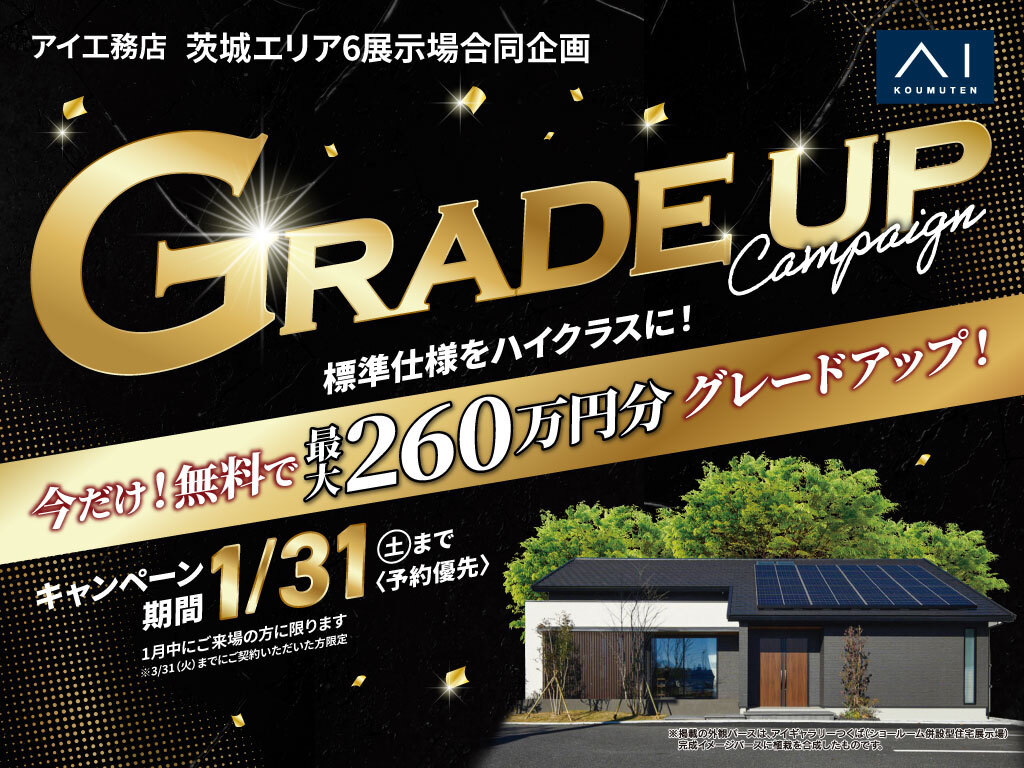 これは茨城エリア6展示場の合同企画ですが、1月開催のグレードアップキャンペーンの概要を表にまとめました。