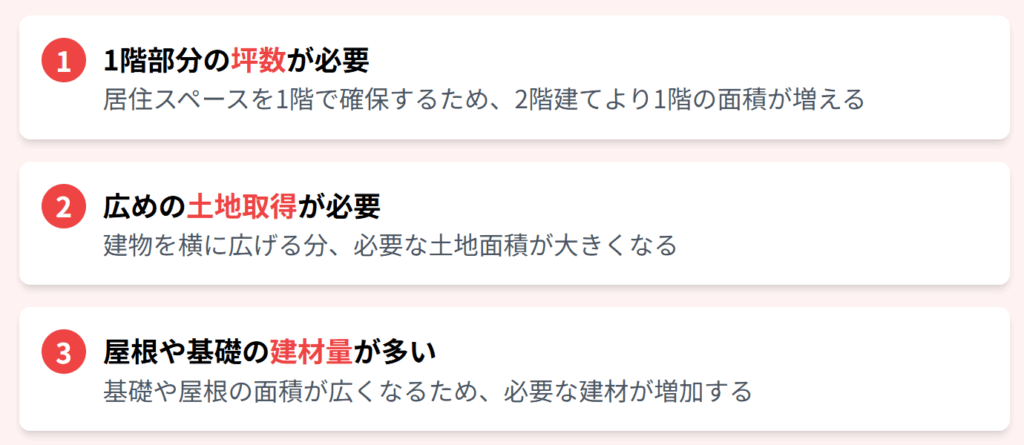 そのため、同じ面積なら2階建て以上住宅よりも1階部分に必要な面積が多くなり、その分坪数が増えることから坪単価が高くなる傾向にあります。