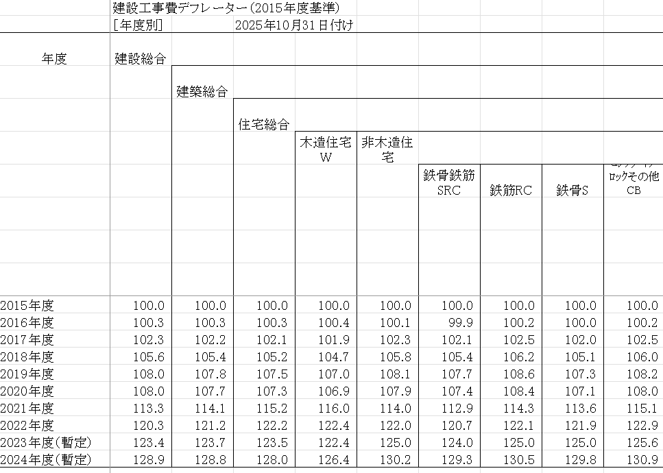 国土交通省が公表してる「最新の建設工事費デフレーター(建設工事費の推移)」を見ると、今から10年前の2015年から値上げに歯止めがかかってないことがわかるわ。