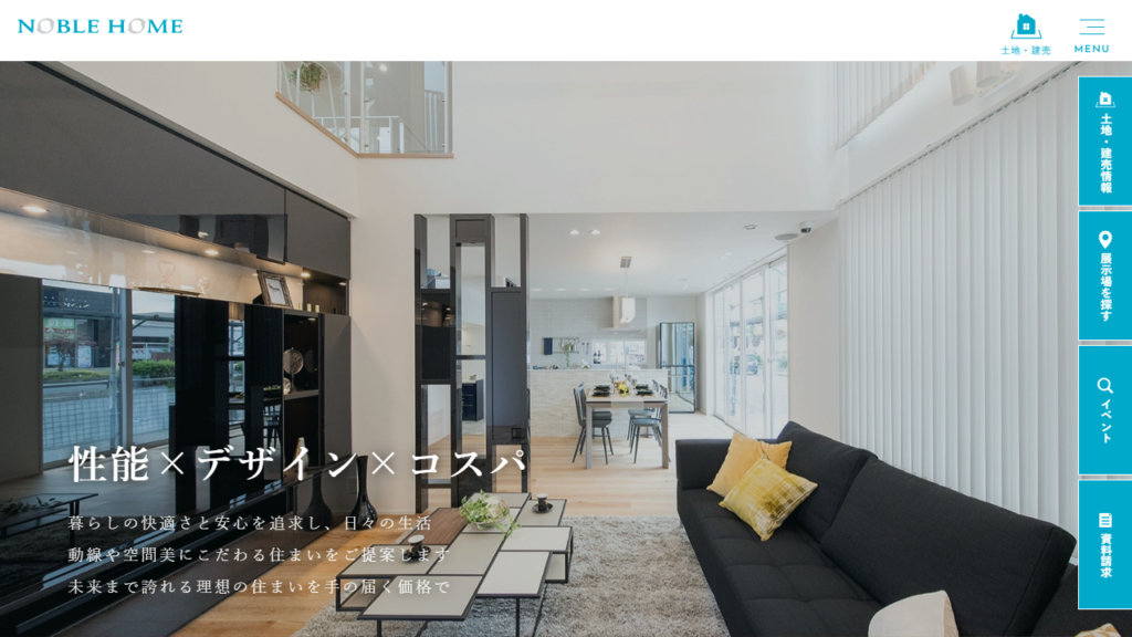 ノーブルホームを一言で表すなら、「地域に根ざし、暮らしの質を高める住まいのパートナー」。耐震等級3相当の構造や高断熱性能など、安心・快適な住環境を提供する技術力が強みです。