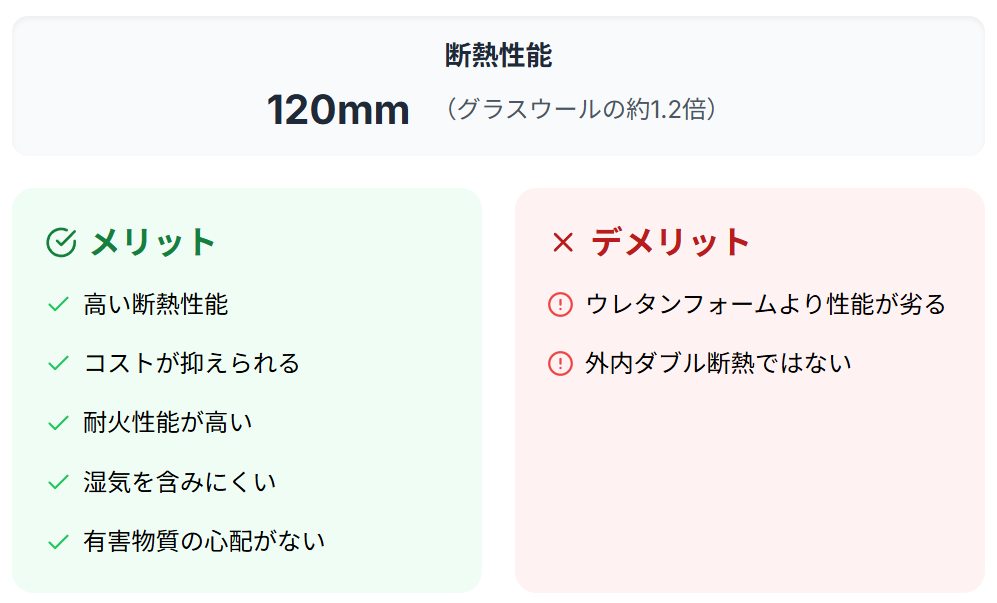 一般的なグラスウールの住まいと比較すると十分高い断熱性能を発揮しているものの、寒冷地などで高い断熱性能を重視した住まいづくりを検討しているときには、物足りないかもしれません。