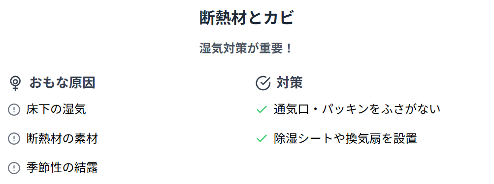 床下の湿気がグラスウールなどの断熱材に継続的に付着することで、カビが発生する可能性もあるでしょう。