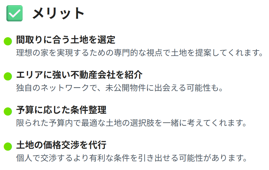 ここからは、一条工務店に土地探しを依頼して得られる主なメリットを4つ紹介します。
