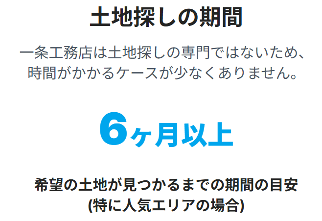 実際に一条工務店へ依頼した人の中には、土地を選ぶだけで半年以上かかったという声もあり、時間がかかる可能性が高い模様です。