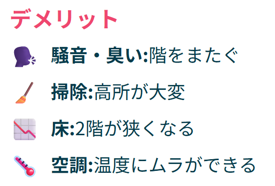 1階と2階の間に壁や天井が存在しなくなることで、音だけでなく臭いも家全体に届きやすくなります。