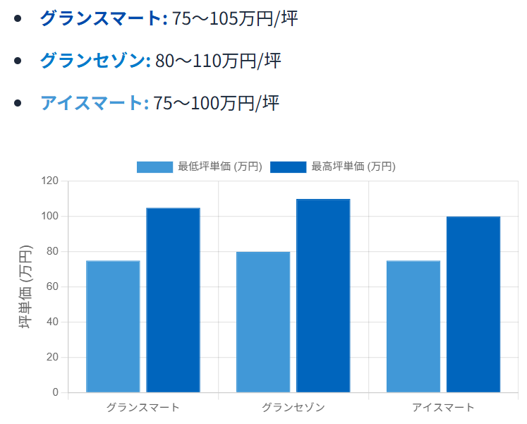 アイスマートの坪単価の目安が75~100万円前後、グランセゾンの坪単価の目安が80~110万円前後です。