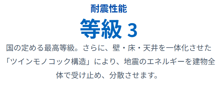 グランスマートの耐震等級は、国の定める耐震性で最高等級に該当する「耐震等級3」です。