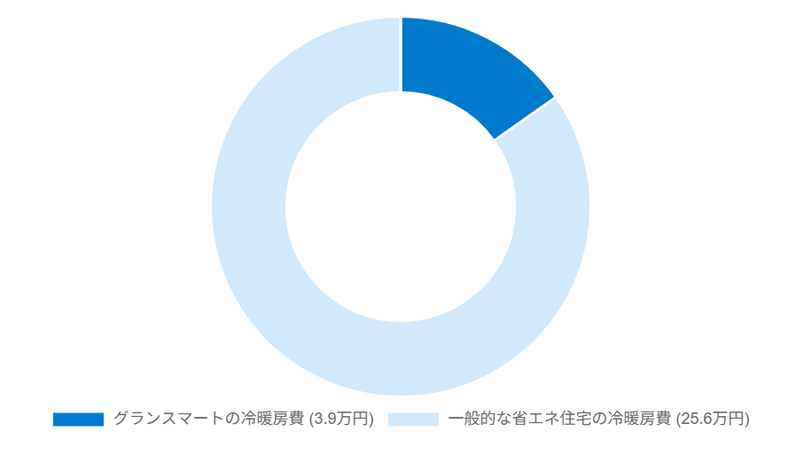 たとえば次世代省エネ基準の住宅は年間冷暖房費25.6万円であるのに対して、グランスマートの住宅は年間冷暖房費は3.9万円になります(※一条工務店のシミュレーションによる試算)。