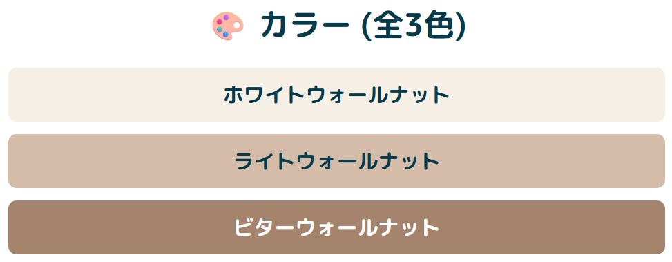 カラーは「ホワイトウォールナット」・「ライトウォールナット」・「ビターウォールナット」の全3色です。