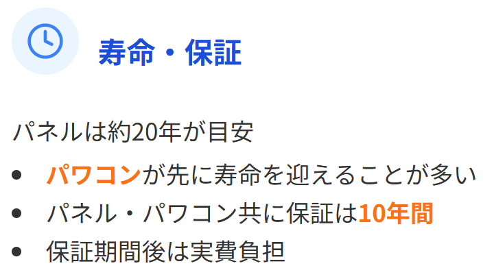 太陽光パネルやパワーコンディショナーの耐用年数は一般的に20年のため、保証期間の10年を過ぎたあとに不具合が発生した場合、修理や交換の費用はオーナーが実費で負担することになります。