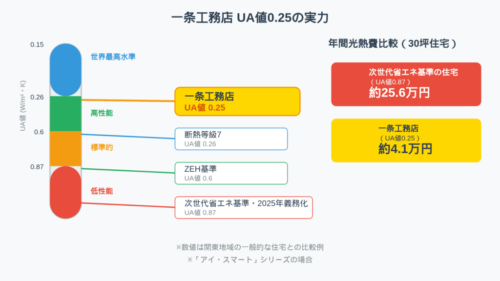 一条工務店の住宅が採用しているUA値0.25という数値は、国内基準を大きく上回る断熱性能です。