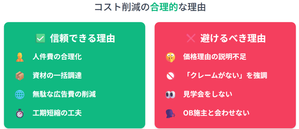 長期にわたって安心して暮らせる空間であるべきだからこそ、コスト削減の理由を明確に説明できない業者は避けましょう。
