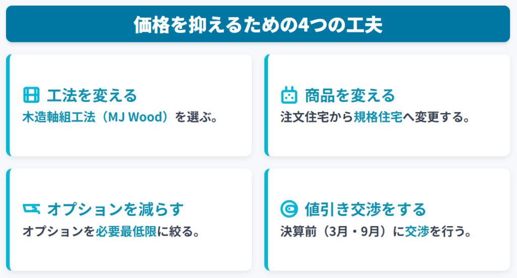 ミサワホームの住まいをできるだけ安く建てたいとき、価格を抑える方法はたくさんあります。