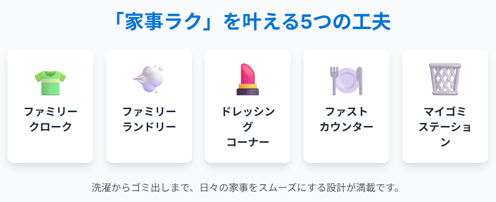 三井ホームのルーカスには、共働き世帯の家事を楽にするための以下のような設備が設けられています