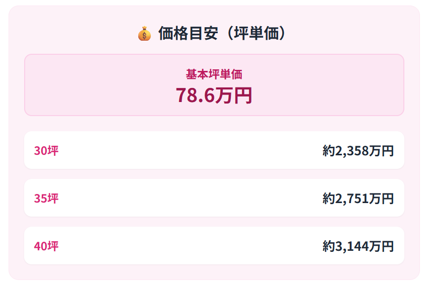 三井ホームでは、シュシュクールのプロトタイププランの坪単価を「78.6万円」と発表しています。