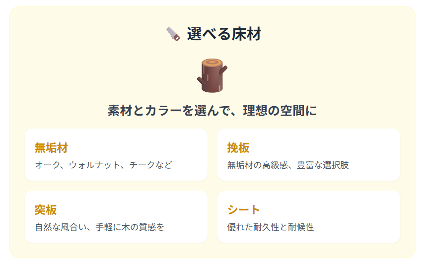 | シート(耐候性と耐久性の高いフローリング) | オーク ウォルナット ハードメイプル ブラックチェリー アッシュ |