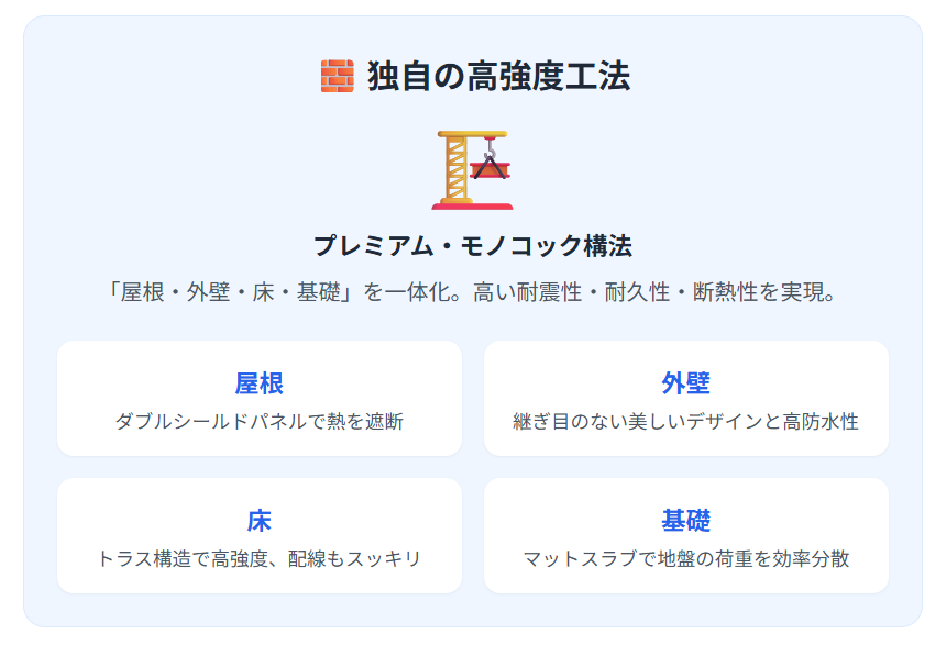 「プレミアム・モノコック構法」は、屋根、外壁、床、基礎それぞれに対して、