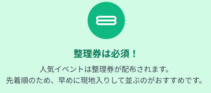 多くのイベントでは、開園時間の30分前くらいから整理券を配布します。
