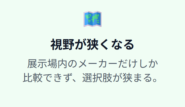 住宅展示場に行くと、視野が狭くなって展示場のハウスメーカーのみを候補にしてしまう恐れがあります。