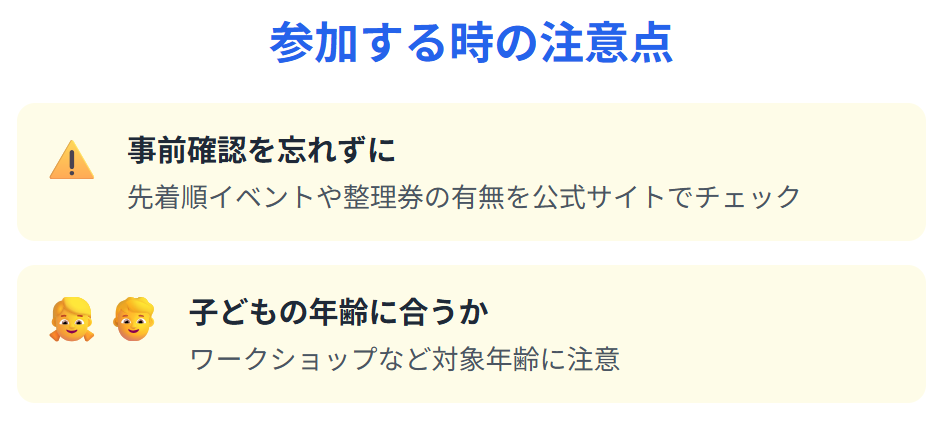 公式サイトのお知らせには、イベントの種類や日時、参加条件、事前予約や整理券の有無などが詳しく掲載されています。