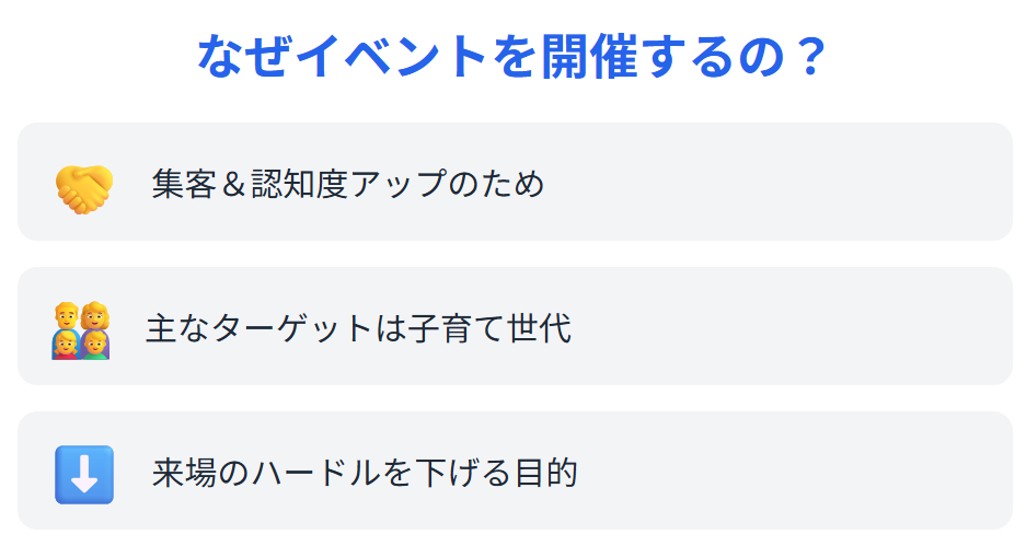 そこで、気軽に楽しめるイベントを企画・実施することで、来場のハードルを下げているのです。