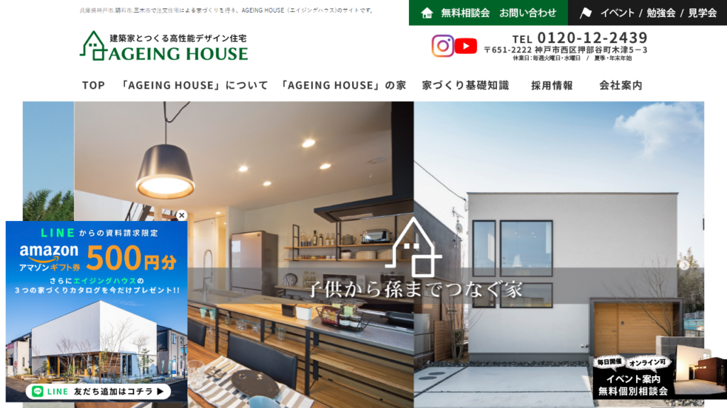 株式会社あっと・はんどが手がける住宅ブランド「AGEING HOUSE(エイジングハウス)」は、建築家と連携した設計+高性能住宅を「手の届く価格」で提供することを掲げています。