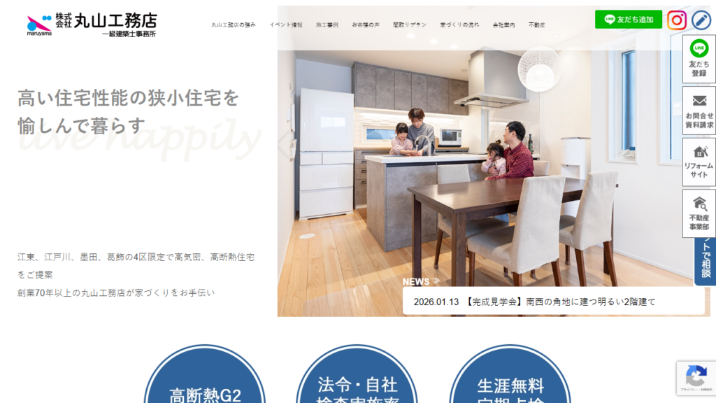株式会社丸山工務店は、創業70年以上の歴史を持ち、担当者は全員建築士という体制で、地元の狭小住宅にも対応した丁寧な家づくりを行う会社です。