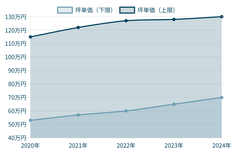 2025年度の坪単価は未確定。ですが、値上がりしている傾向にあるので、今後も上昇していくことが予想されます。