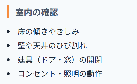- 壁や天井のひび割れの有無を確認