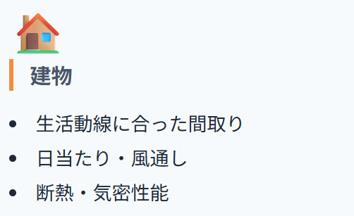 建物は生活動線を意識した間取りか、日当たりや風通し、収納の配置が家族構成に合っているかを一体でチェックするといいでしょう。