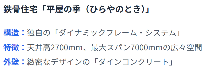 平屋の季(ひらやのとき)は、積水ハウスのオリジナル工法「ダイナミックフレーム・システム」が採用されている鉄骨住宅です。