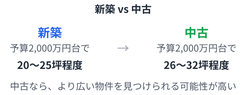 新築だと25坪前後の住宅となりますが、中古であれば、新築で購入した場合よりも広い住宅を見つけられる可能性も高いです。