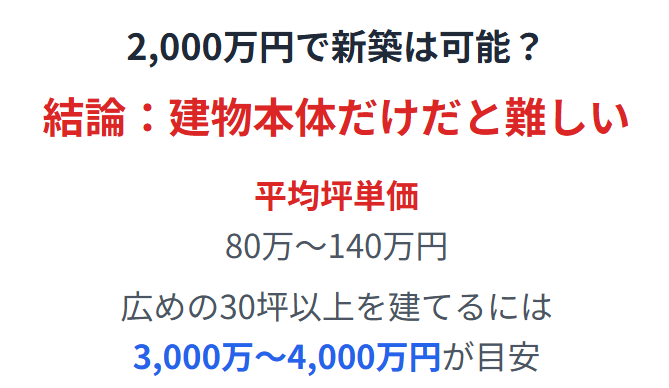 なお、坪数が20坪以下で1LDKみたいなコンパクトな間取りであれば、2000万円以内の予算でギリギリ実現できるかもしれませんが、レアケースすぎますね……。
