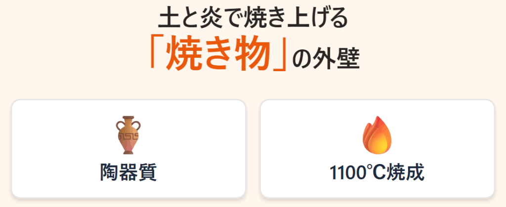 “土と炎で焼き上げる焼き物”という伝統的な素材でありながら、工業製品の精度を両立させている点が最大の特徴です。