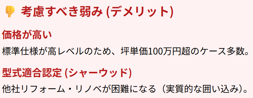 ただし、型式適合認定を受けた住宅には、そのハウスメーカー独自の部材や独自の工法が使われているため、リフォームやリノベーションを検討したい場合も他社を入れることができず、実質囲い込まれる状況になります。