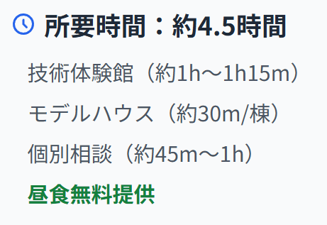 続くモデルハウスの見学では、1棟あたり約30分の見学時間が確保されており、複数棟を巡る場合は全体で3時間半程度になることもあります。