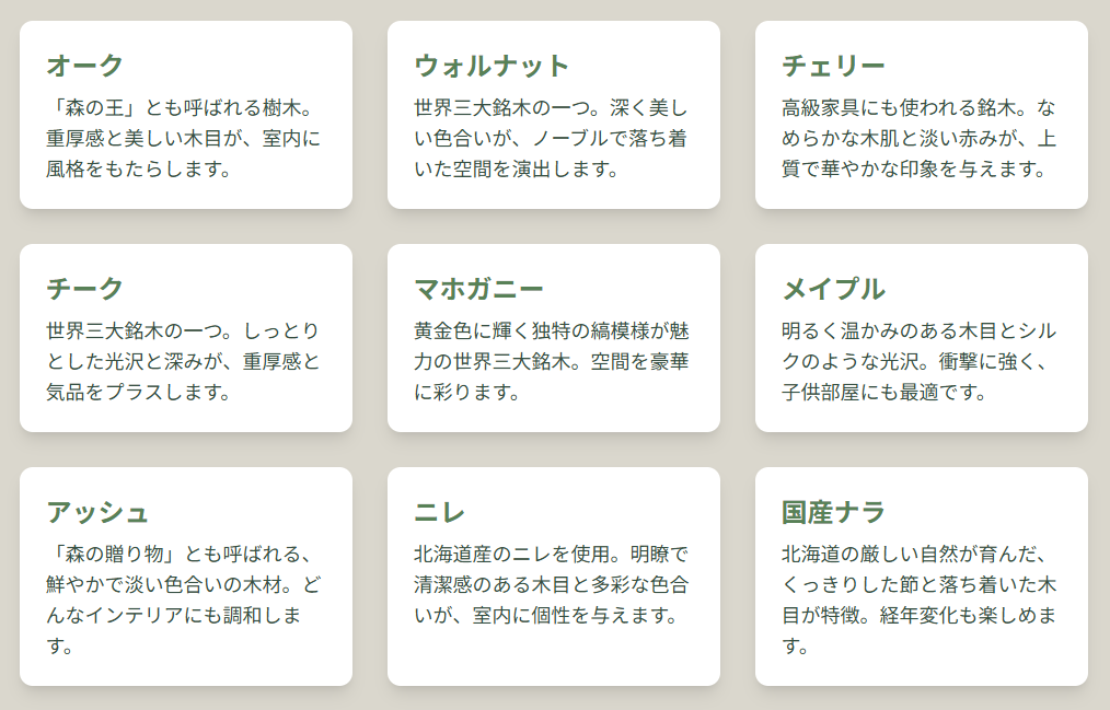 | 無垢フロア | 住友林業クレスト114フラット | アッシュ、オーク、チェリー、チーク、ウォルナット、マホガニー | 日本古来の高級材を使用、濃淡や節がはっきりしている |