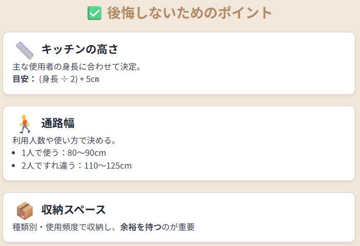 キッチンの収納では、以下の3つのポイントに気を付けましょう。