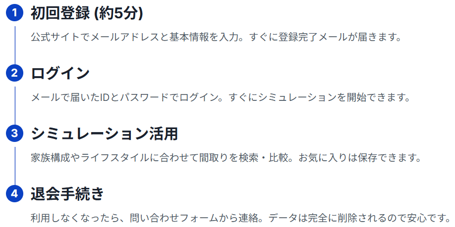 住友林業の間取りシミュレーションは、初回登録とログインを終えればすぐ使えます。