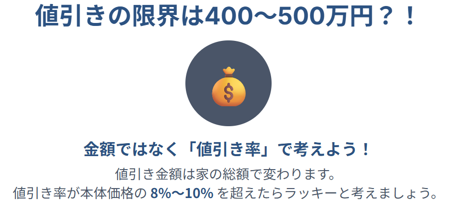 たとえば2500万円の家と5000万円の家では、同じ500万円の値引きでも値引き率が20%と10%になりますから、まるっきり違います。