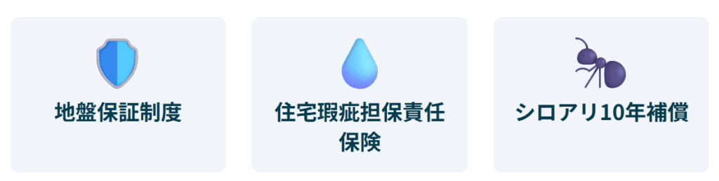 | 保証内容 | ・地盤保証制度(10年) ・住宅瑕疵担保責任保険(10年) ・シロアリ補償(10年) |