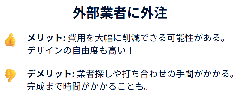 他社に依頼するメリットとして、費用を大幅に削減できる可能性があること、デザインや仕様の自由度が高まることが挙げられます。