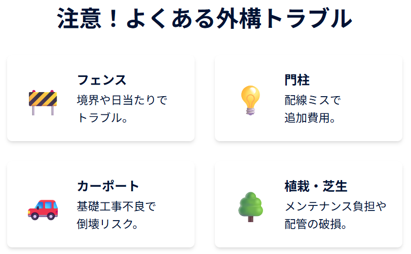 外構計画が不十分だと、費用・デザインの面でトラブルが生じる可能性があります。