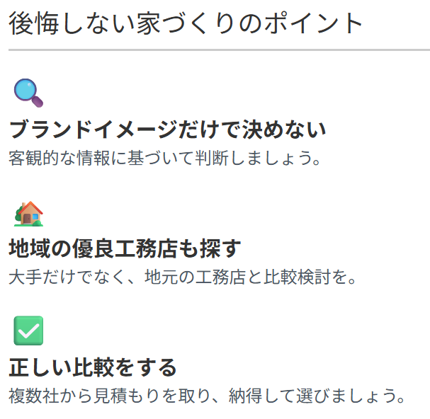 周囲の評判や知名度に左右されるのではなく、自分自身の目で確かめ、納得したうえで選ぶことが、後悔のない家づくりにつながります。