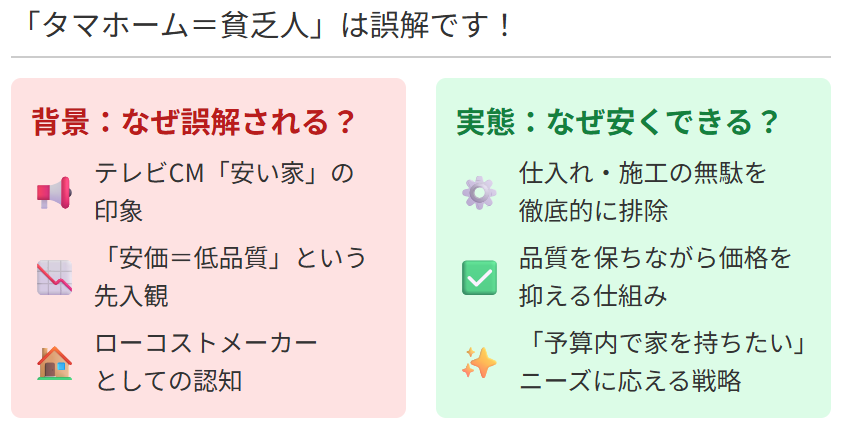 「タマホーム=貧乏」というイメージを持たれがちな理由は、同社が過去にローコスト住宅メーカーとして広く認知されていることにあります。
