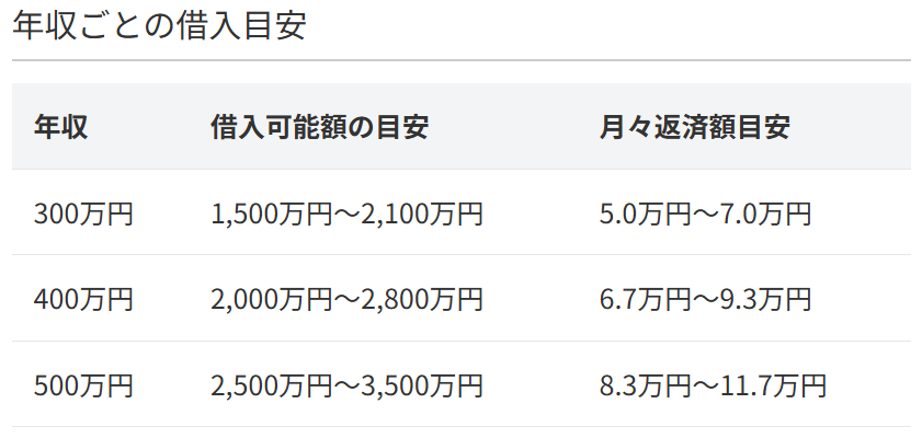 以下、年収ごとの借入可能額と月々の返済目安をまとめたのでご覧ください。