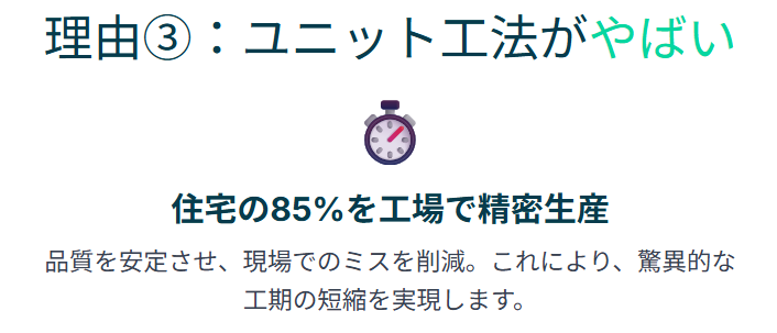 ユニット工法を用いることで、一般的なハウスメーカーでは基礎工事から引き渡しまでの期間が約120日なのに対して、トヨタホームでは約45日と工期の短縮が可能です。