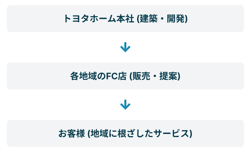 トヨタホームではディーラー制度のやり方を転用し、住宅の建築・開発は本社が行い、顧客への提案や販売は各地域のフランチャイズ(FC)店が行っています。